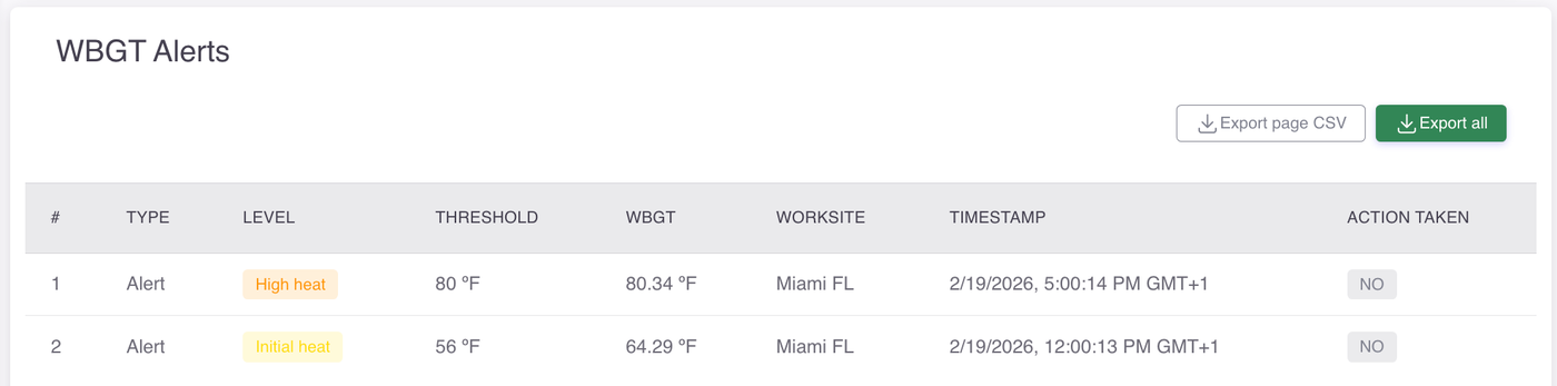 This table logs each alert triggered during the selected time frame, giving you a detailed record of when and where heat thresholds were exceeded, which level was reached, and whether your team took action in response.