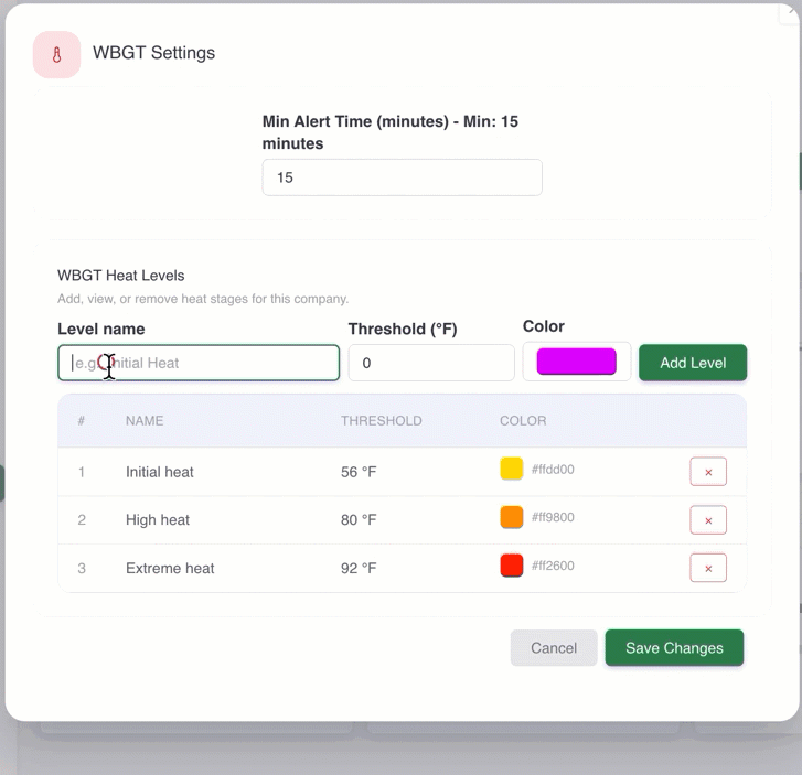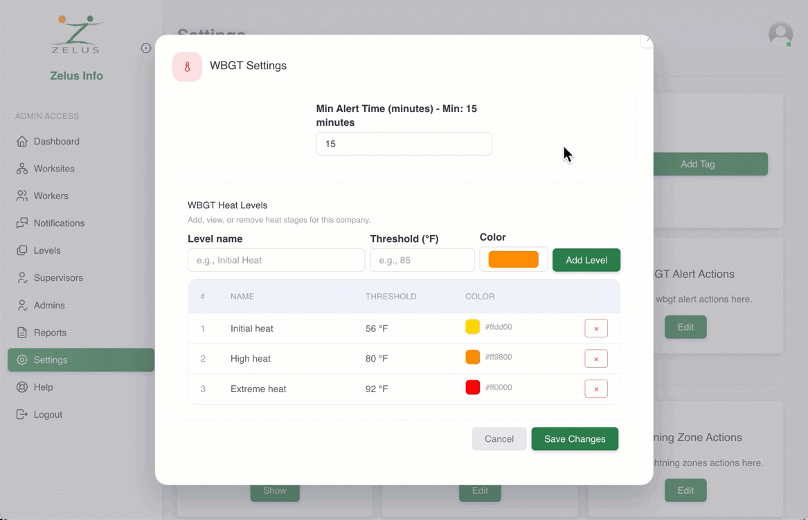 ℹ️ When the WBGT reaches a worksite's heat level, the alert is raised immediately. When the WBGT falls below a threshold, Zelus downgraes the alert to the appropriate level only after the WBGT is sustained below that threshold for the minimum alert time.