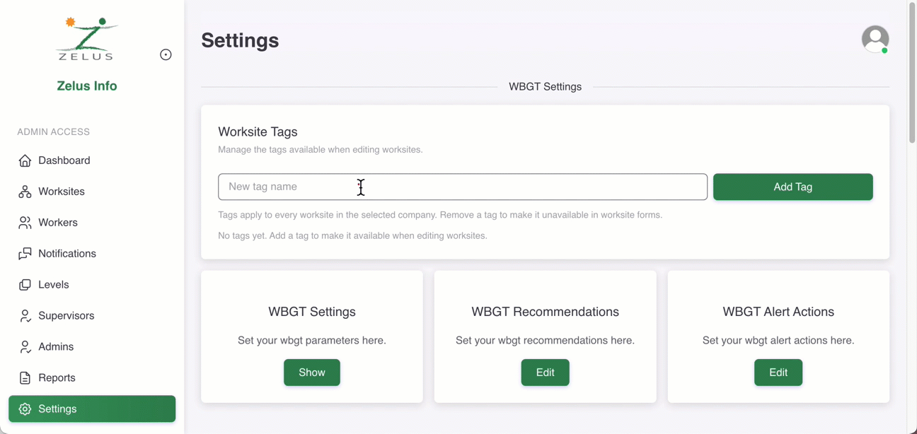 ℹ️ To make a tag unavailable in worksite forms, remove it from the tags list in the WBGT Settings.